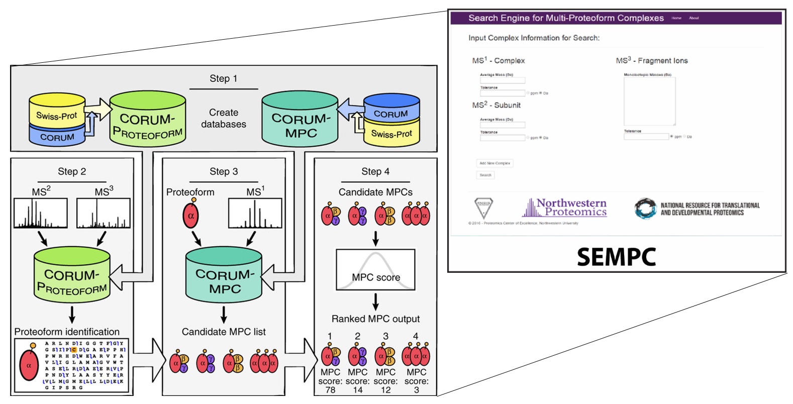 Proteoforms often combine into non-covalent complexes. The possible combinations must be validated and scored as described above. SEMPC (“Search Engine for Multi-Proteoform Complexes”), is then used to characterize multimeric proteoform complexes. This search engine was also developed in-house. (Nat. Methods, 2016, 13, 237-240)